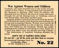 1938年にアメリカで初版が発行され、第二次世界大戦直前の戦争の惨禍を巧みに描写しています。ナチスの強制収容所やイギリスのガスマスクなどが描かれ、裏面には「Don't let it over here(こんなことが起きるな)」という説明文が添えられています。再版またはオリジナル版は、ご要望に応じて入手可能です。カードサイズ:約80×64mm