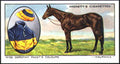 Shows a selection of the previous season's big-race winners in paddock surroundings, with the racing colours of each owner pictured on the left. Includes Golden Miller who "In 1934 achieved his third success in the Cheltenham Gold Cup and won the Grand National in record time." CAN BE SOURCED UPON REQUEST. Approximate card size: 68x36mm