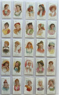A stunning set of head and shoulder illustrations showing girls from various countries in outfits befitting their purpose. Theatre attire, evening dress and on holiday to name but a few. This set really does show an amazing attention to Fashion details from so many countries. Approximate card size: 68x36mm