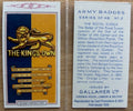 装飾的な巻物が付いた、全国各地の陸軍バッジのカラー写真です。掲載されている連隊には、バフ連隊、ライフル旅団、ロイヤル・スコッツ・グレイ連隊、グレナディア・ガーズ連隊などがあります。カードの裏面には、各連隊の栄誉や興味深い事実など、詳細が記載されています。再版またはオリジナル版は、ご要望に応じて入手可能です。カードサイズ:約68×36mm