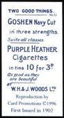 オリジナルは非常に希少なため、これらの復刻版は、ボーア戦争時代の軍事史を彩る貴重な資料を、コレクターの皆様にお楽しみいただける機会となります。カラーイラストは、ユニフォームの多様性をさらに際立たせています。裏面には、同社のパープルヘザータバコが描かれています。復刻版またはオリジナルは、ご要望に応じて入手可能です。カードサイズ:約68×36mm